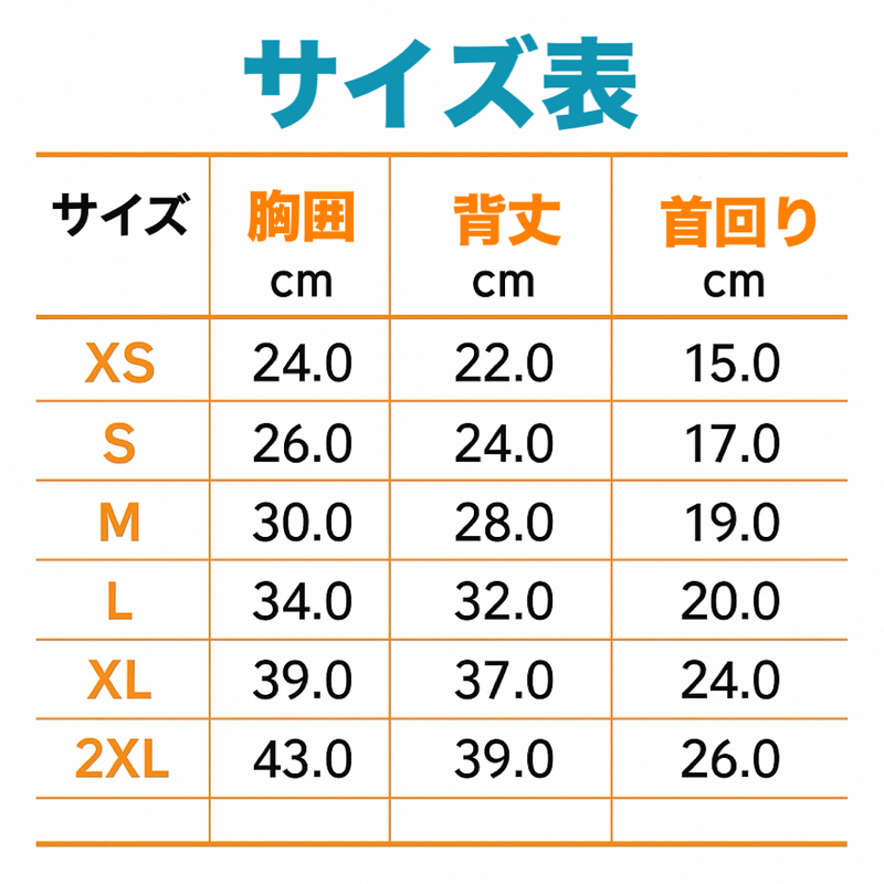 首の付け根からしっぽの付け根までの長さを測ってください。 - 首回り(くびまわり)