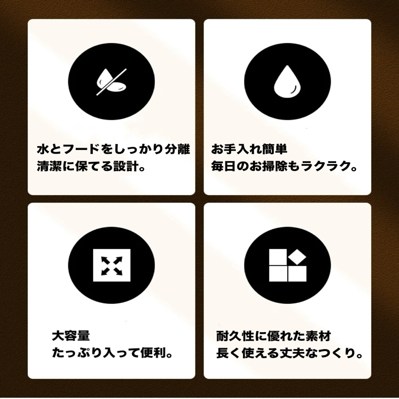 電源不要の重力式で、自動的にごはんとお水を補給。外出中も旅行中も、いつでも新鮮&たっぷり。