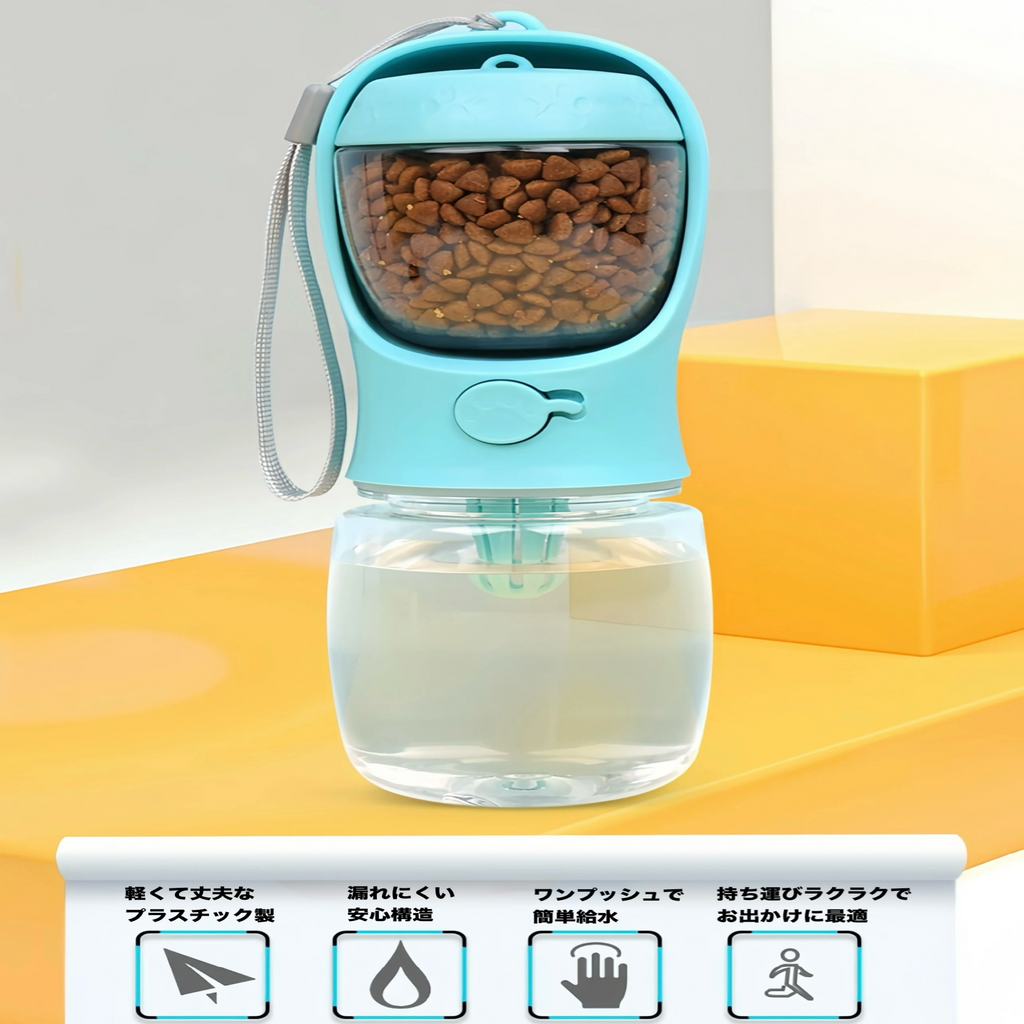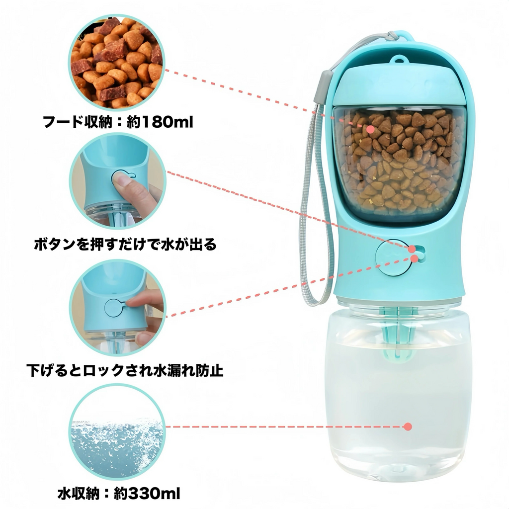 取り外し式のフードケースとワンタッチ給水ボタン付きで、片手で簡単操作。お出かけがもっと自由に、もっと楽しくなります。