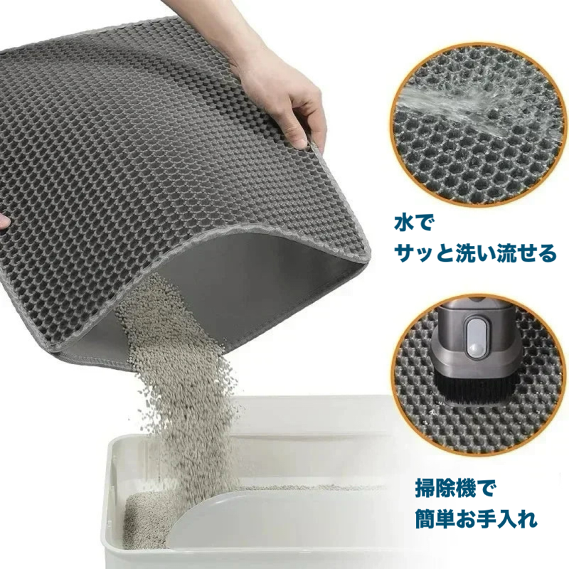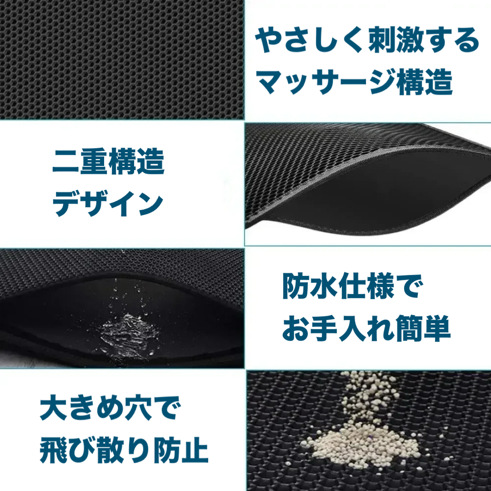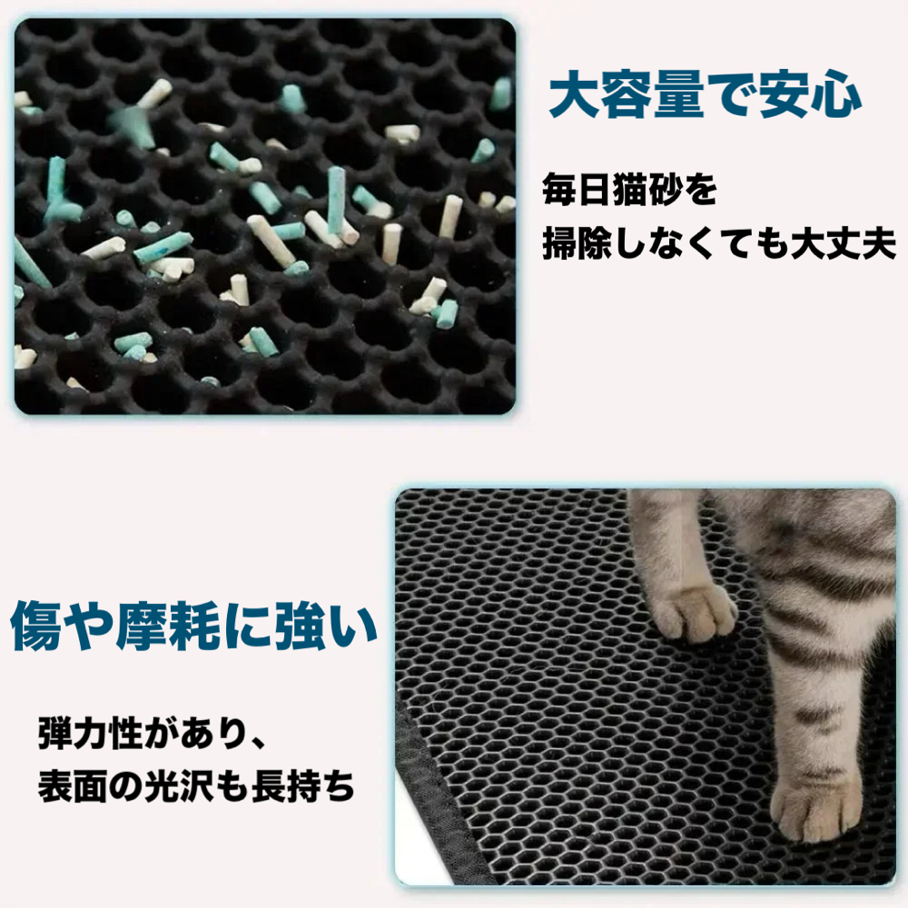 この猫用トイレマットは、ダブルハニカム構造で砂をしっかりキャッチし、床をしっかり守ります。やわらかく、優しいEVA素材で、敏感な猫の肉球にも安心設計。愛猫がゴロゴロしたくなるほどの心地よさです。