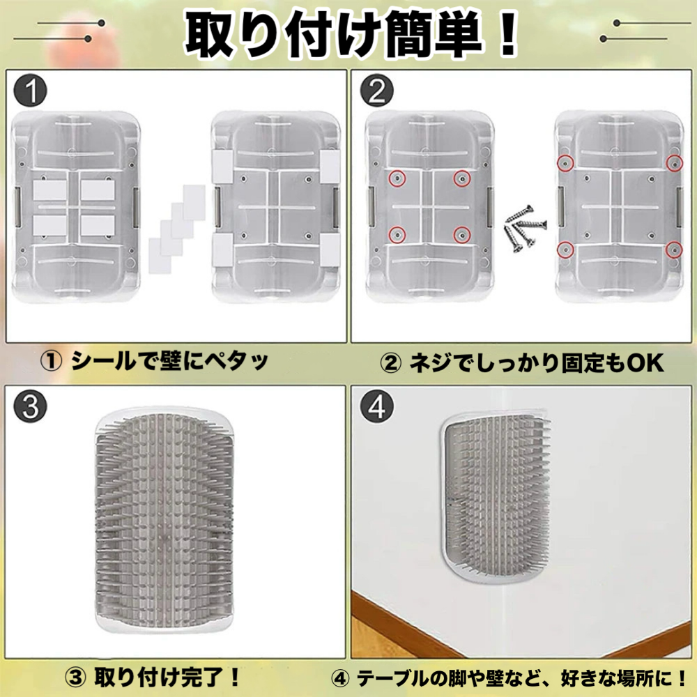 まるで「ママの手」のようなやさしいタッチで、角に取り付けるだけで、猫ちゃんが自分でスリスリできちゃう!毛が抜ける季節も、このブラシがあればお部屋はいつも清潔&快適。