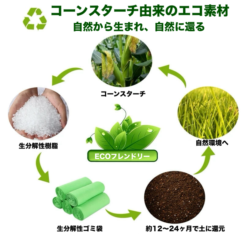 この【エコ・ペットうんち袋】は、トウモロコシ由来の生分解性素材で作られており、自然に分解されて環境にやさしい安心仕様。約12〜24ヶ月で土に還ります。